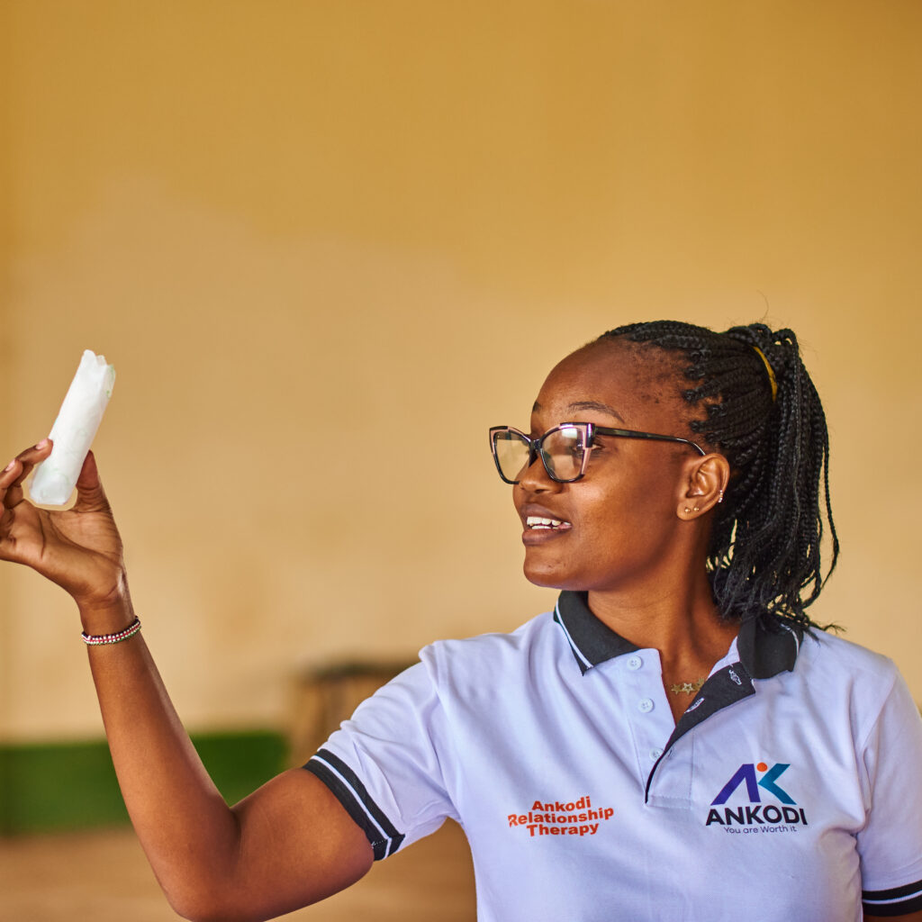 Our Health Educator, Syprose demonstrating how to dispose a used pad